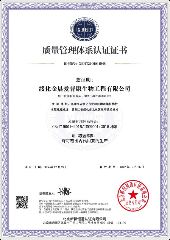 綏化金晨愛普康生物工程有限公司位于黑龍江省中南部地區(qū)的綏化市北林區(qū),所處位置東經124度,北緯45度,位于松嫩平原的呼蘭河流域,“有寒地黑土,塞北江南”的美譽,是全國重要的商品糧基地,屬中溫帶大陸性季風氣候,四季分明,雨熱同期,冬季冰雪覆蓋,夏季降雨集中氣候溫熱濕潤。綏化金晨愛普康生物工程有限公司是一家專業(yè)從事健康養(yǎng)生產品研發(fā)、生產及銷售企業(yè),公司占地總面積8000平方米,建筑面積5000平方米,公司周圍無任何污染源,是食品生產基地。公司生產車間潔凈度級別達到10萬級,同時擁有數(shù)十臺先進的生產設備及高科技檢驗儀器,從產品的原輔料、中間品、成品到銷售的全過程嚴格把關,使生產中每道工序都符合產品的高標準要求,從而保證了公司生產的每一袋產品合格,無質量缺陷。綏化金晨愛普康生物工程有限公司率先采用了企業(yè)資源ERP管理系統(tǒng),肩負著養(yǎng)生產業(yè)的重要課題,同時又是江蘇省國家藥用植物重點實驗中心科研成果轉化的生產試驗基地,公司核心成員均為本科以上學歷。生產的產品有近五十個品種的代用茶產品,公司先后通過HALAL國際認證,編號為SSPY-201318-33849;ISO9001質量管理體系認證編號為XBH···